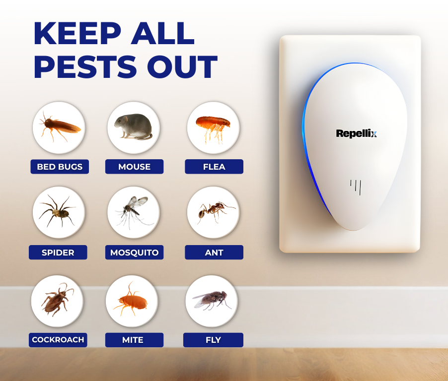 Repellix is engineered to drive out 40+ types of pests from your home using advanced ultrasonic technology. It targets common intruders such as ants, cockroaches, spiders, bed bugs, mosquitoes, flies, silverfish, fleas, ticks and moths, as well as rodents including mice and rats.